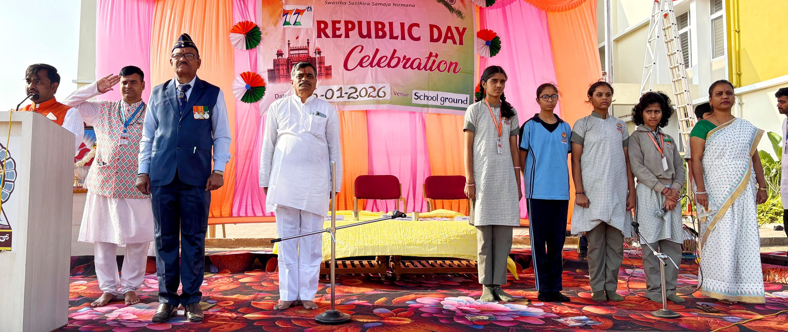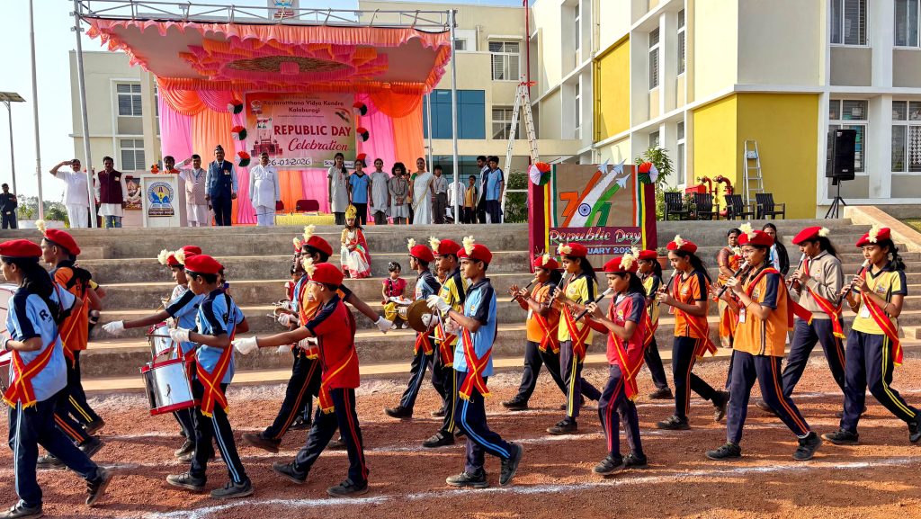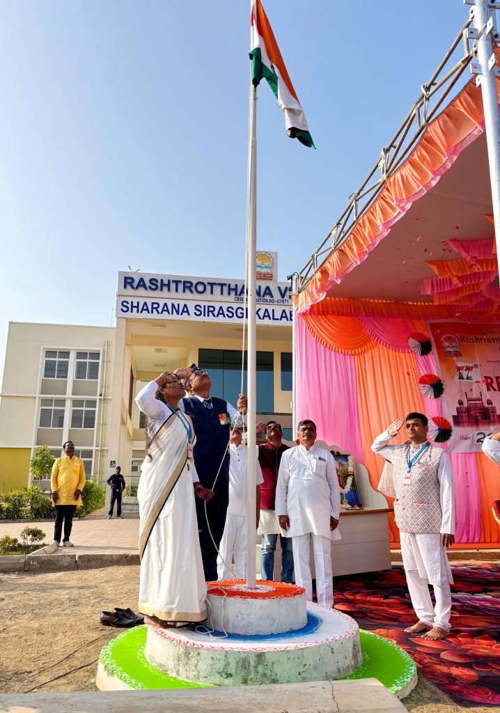 Kalaburagi, Jan. 26: The 77th Republic Day was celebrated herein Rashtrotthana Vidya Kendra – Kalaburagi. Sri Vitthal Rao Kulkarni, former Indian Air Force, was the chief guest. The dignitaries hoisted the national flag. The students sang patriotic songs and performed dances. They spoke about the importance of the day in Hindi and English as well as Kannada and Sanskrit. The students presented a disciplined yoga demonstration and displayed a military display. The chief guest, Sri Vitthal Rao Kulkarni, former Indian Air Force, gave an inspiring speech and motivated the students to serve the nation with discipline and dedication. He spoke about the importance of punctuality, discipline, unity, responsibility and being a good citizen. He also explained how the Air Force teaches discipline, financial responsibility and proper use of money.
